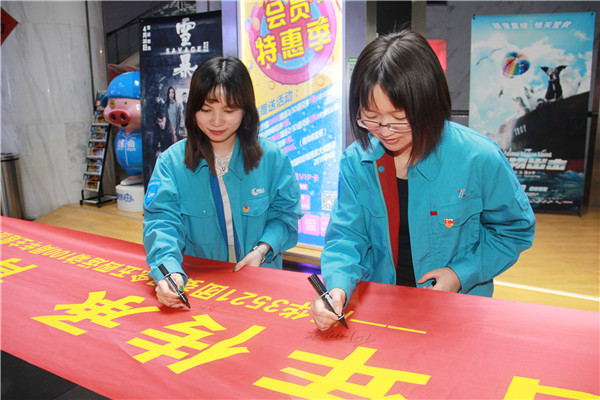观影结束后团员青年们还在“青春心向党·建工新时代”的横幅上签名励志。