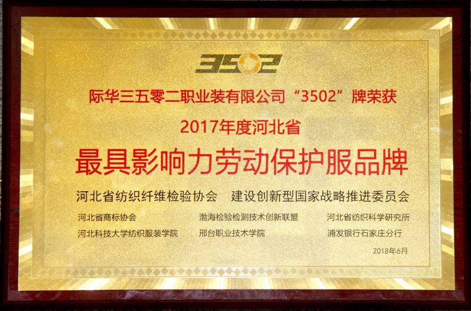 近期,际华3502公司“3502”牌荣获2017年度河北省最具影响力劳动保护服品牌。这一荣誉的获得为企业技术创新、提升品牌价值进一步奠定了基础。
