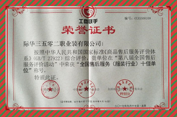 近日,第八届全国售后服务评价活动在北京钓鱼台举行,际华3502公司在此次评选活动中荣获全国售后服务行业十佳单位称号,量体服务中心量体师刘有林、王慧玲被评为全国售后服务先进个人。
