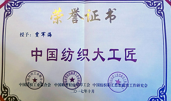 10月19日,在西安召开的“全国纺织行业‘中国纺织大工匠’先进事迹推介大会”上,中国纺织工业联合会、中国财贸轻纺烟草工会、中国纺织职工思想政治工作研究会联合命名20名同志为“中国纺织大工匠”,际华三五四二纺织有限公司前纺车间电工贾军海获此殊荣,是湖北省唯一获奖者。