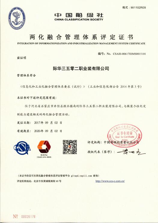 近日,际华3502公司通过了国家工信部“两化融合管理体系”贯标评定,取得了“两化融合管理体系”证书。