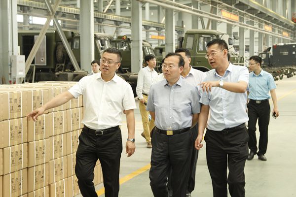 张东明一行在该公司执行董事、党委书记佟胜利陪同下,参观了公司总装生产线、防弹车生产线和自行式炊事车、500人营炊事车、主食加工方舱,饶有兴致的登上了500人营炊事车进行体验,对产品的使用功能、销售市场等进行了详细的询问。在防弹背心装配线前驻足观看,并亲自试穿了防弹背心,对产品质量、设计理念给予高度评价。期间听取了佟胜利关于公司生产规模、主打产品、经营理念的介绍。