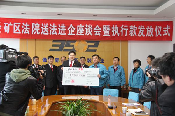 在信息中心召开的座谈会上,党委书记张凤林介绍了公司的发展历程,对井陉矿区法院发放的1500万元执行款表示衷心的感谢。他说,企业要想成功,就必须依法经营,在法律的框架下把企业做强做大。3502公司今后一定积极践行各项法律法规,依法治企,守法经营,一如既往的以优质的产品和优良的服务回报社会。同时,要加强同司法机关的联系,认真学法、懂法、用法,用法律维护公司和职工的合法权益,为公司的发展做出积极的贡献。张延军也表示,井陉矿区法院作为国家司法机关,今后一定加大对案件的执行力度,对于企业的纠纷做到“快立、快审、快执”,尽最大的努力为企业的发展保驾护航。
